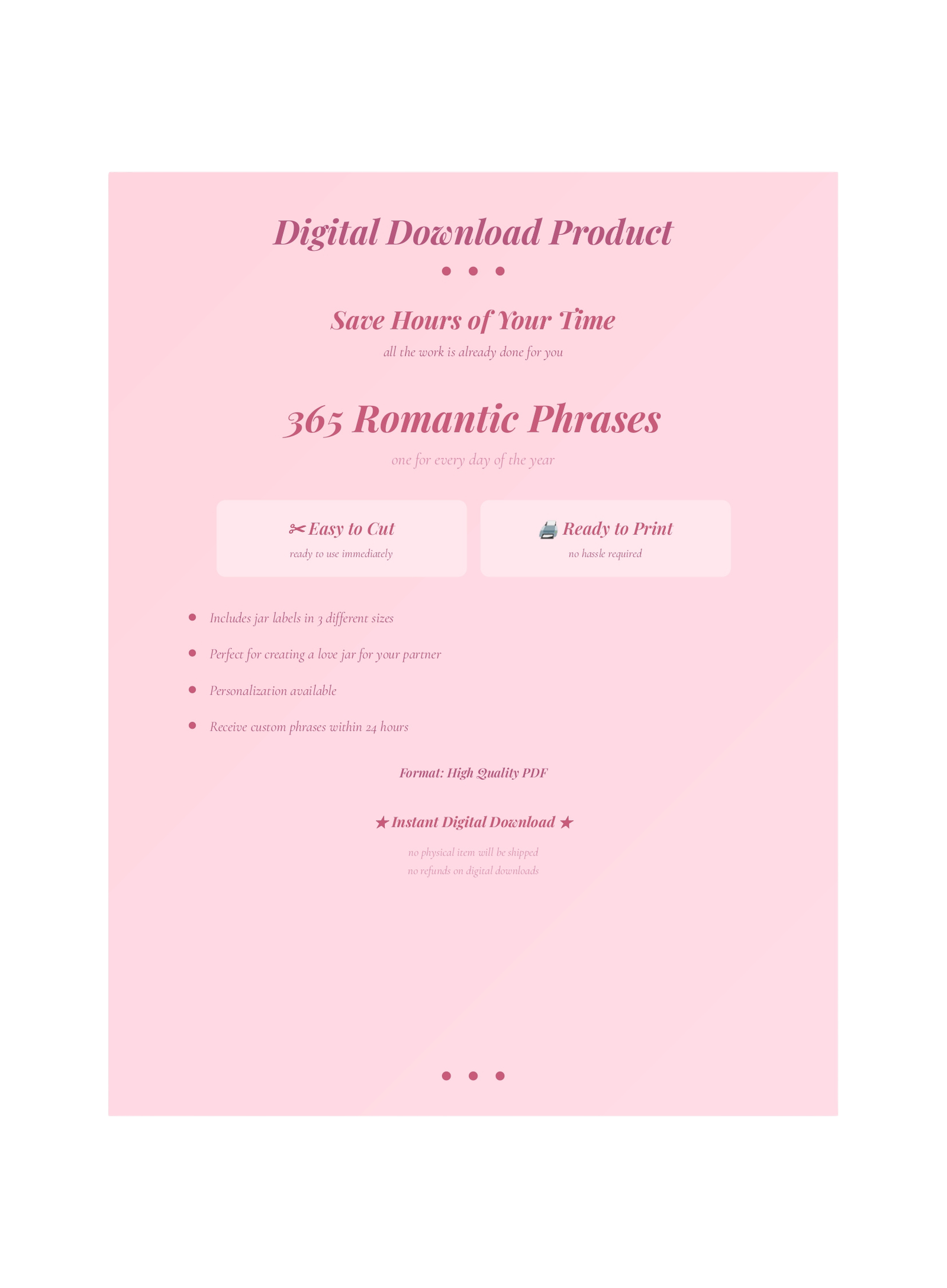 No more hours spent thinking of what to write. No more struggling with design. We’ve done all the work for you—365 heartfelt romantic phrases, beautifully designed and ready to print. Just download, cut, fold, and fill your jar. The perfect gift is just minutes away.